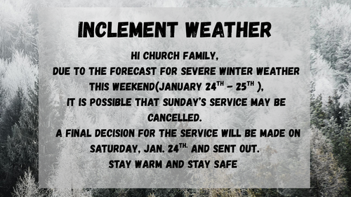 Based on the current forecast we will not have Sunday Service but a final decision will be posted on Facebook on Saturday. Stay safe and warm